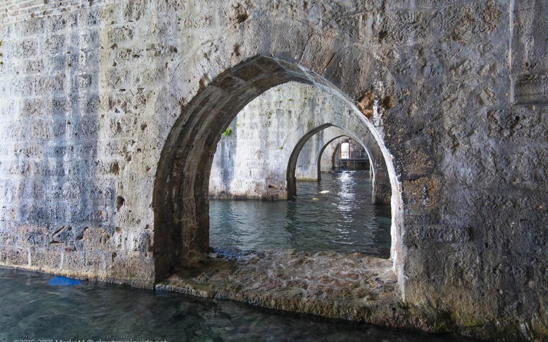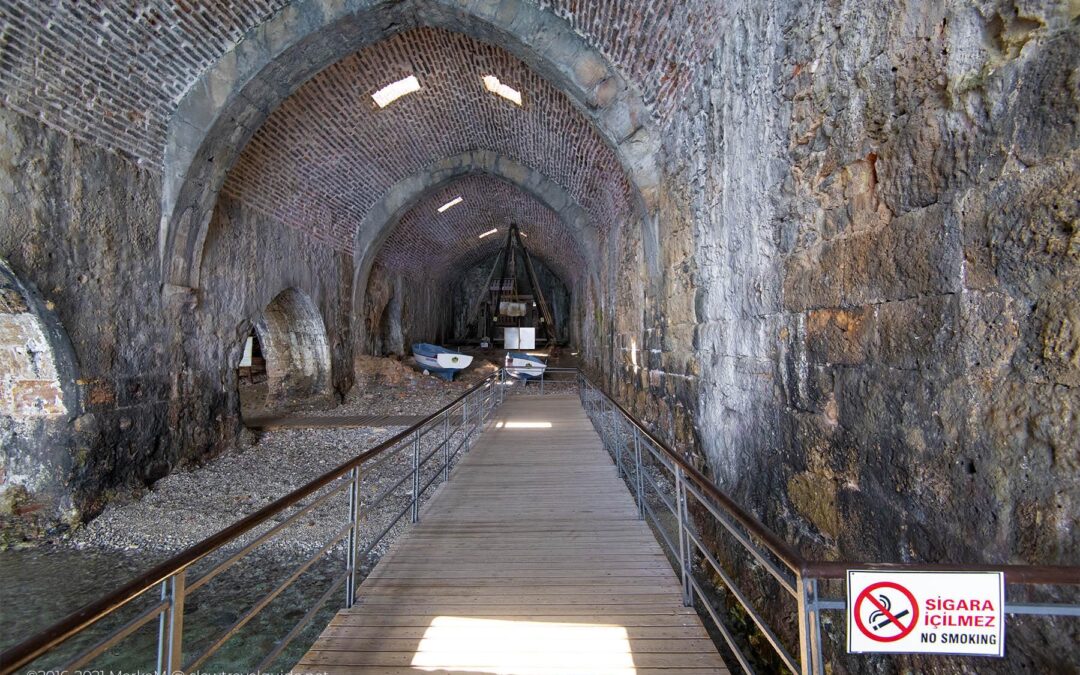 The Seljuk-era shipyard has five vaulted piers built with ashlar walls and brick vaults. The Shipyard or Tersane in Turkish was used to build and repair ships and as storage for ships.