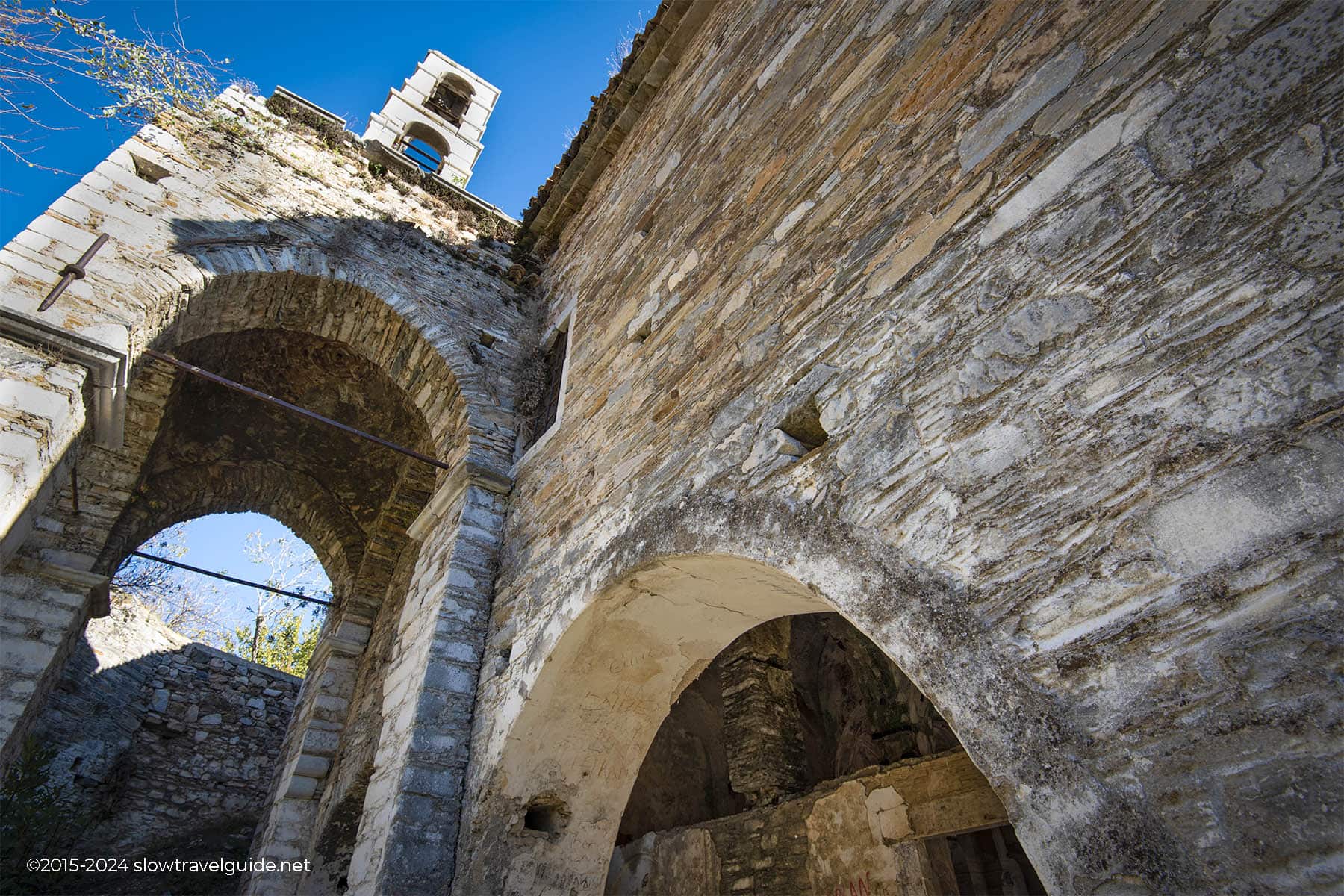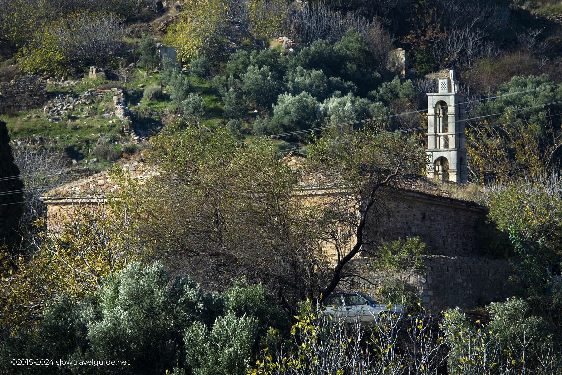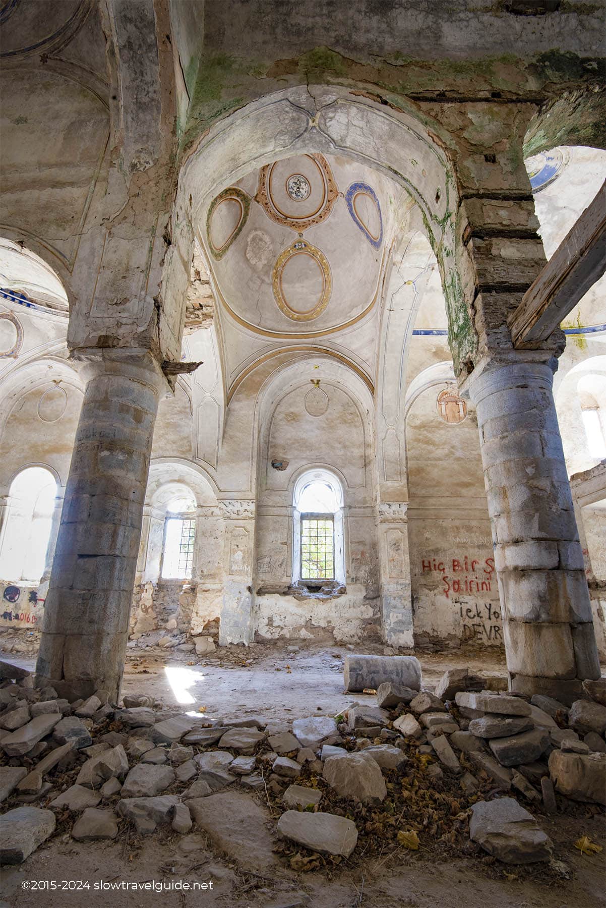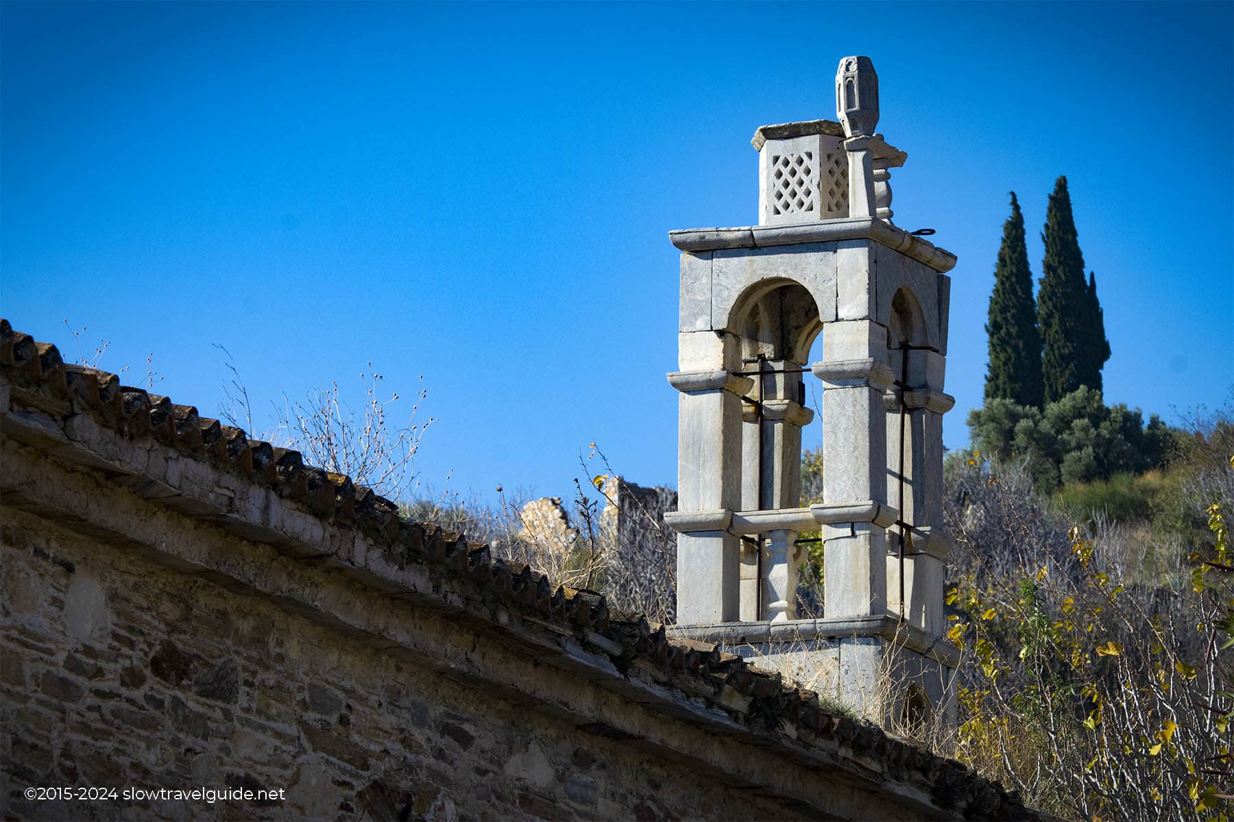 İki apsisi ve iki göbeği olan bu kilisenin ön salonunda tipik bir Yunan çan kulesi var. Güzel ve sessiz bahçede dolaşırken gördüğümüz iskelet kalıntıları karşısında şaşkınlığımızı gizleyemedik.