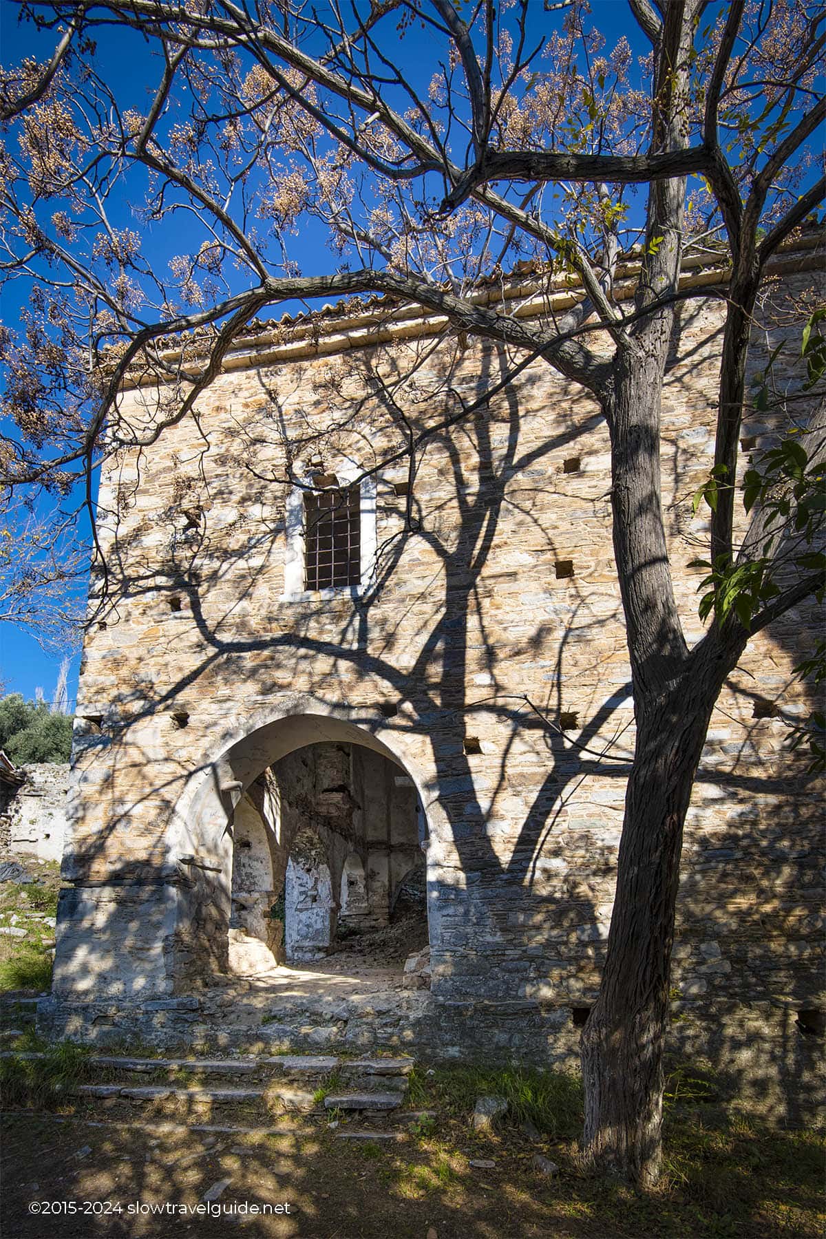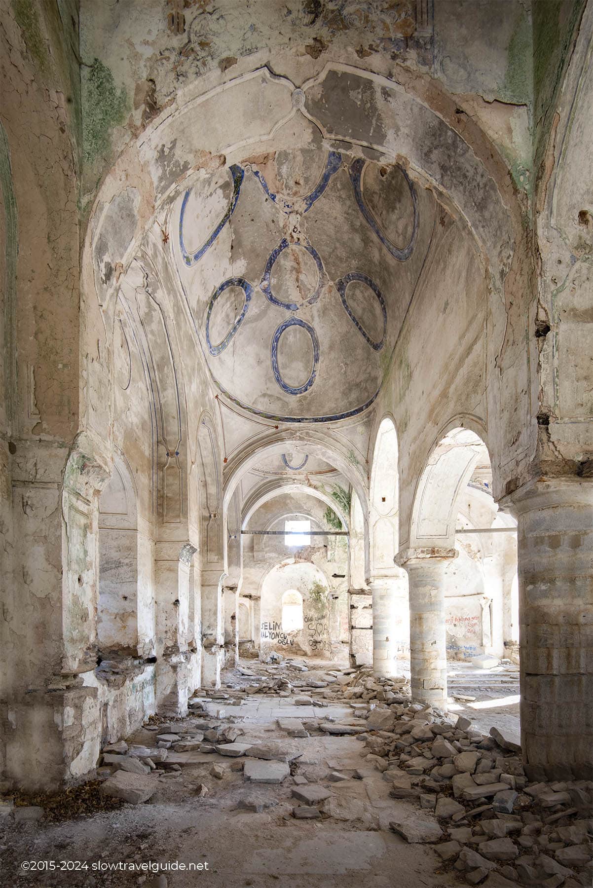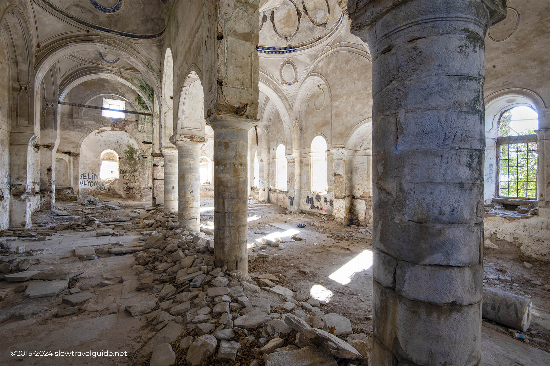 İki apsisi ve iki göbeği olan bu kilisenin ön salonunda tipik bir Yunan çan kulesi var. Güzel ve sessiz bahçede dolaşırken gördüğümüz iskelet kalıntıları karşısında şaşkınlığımızı gizleyemedik.