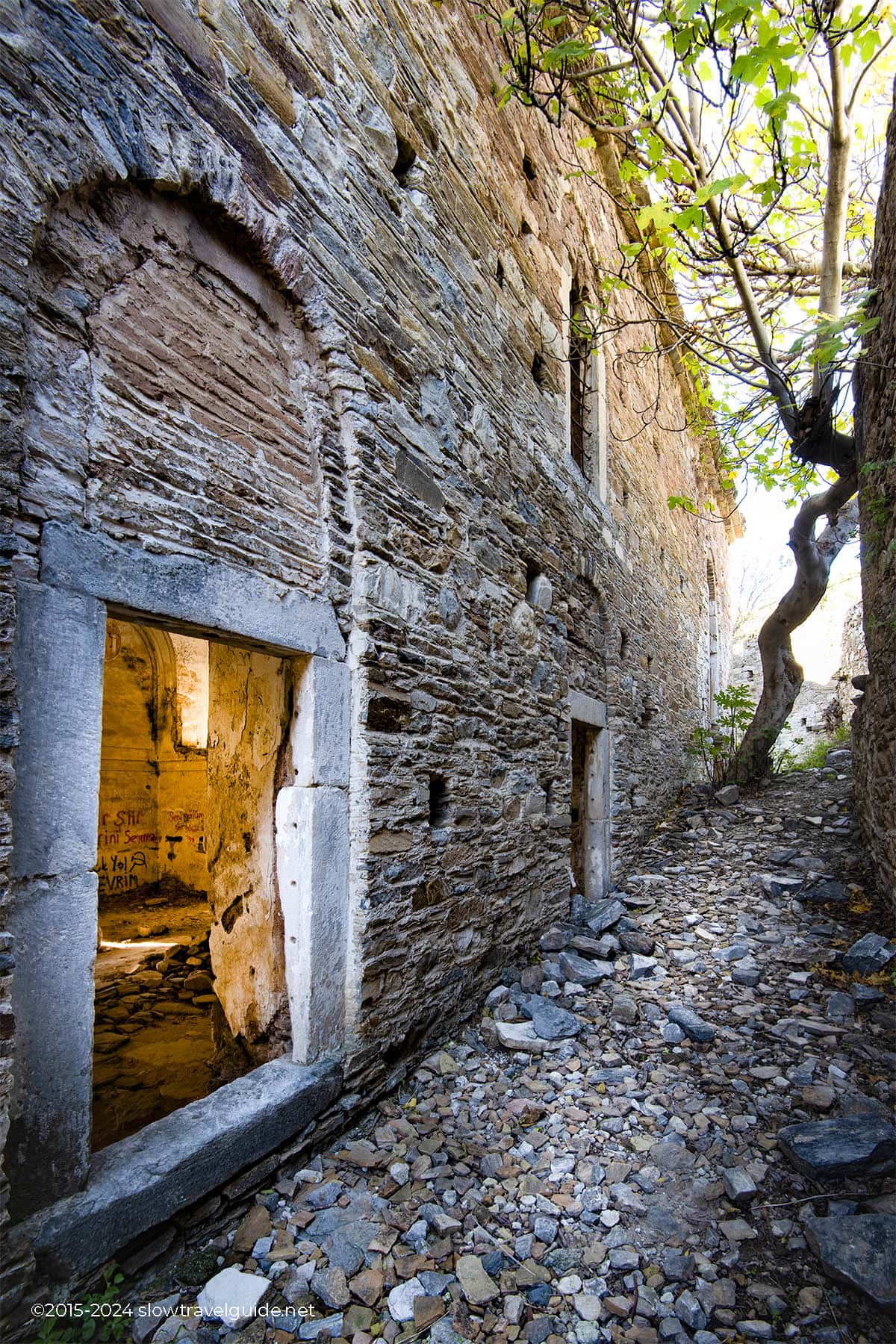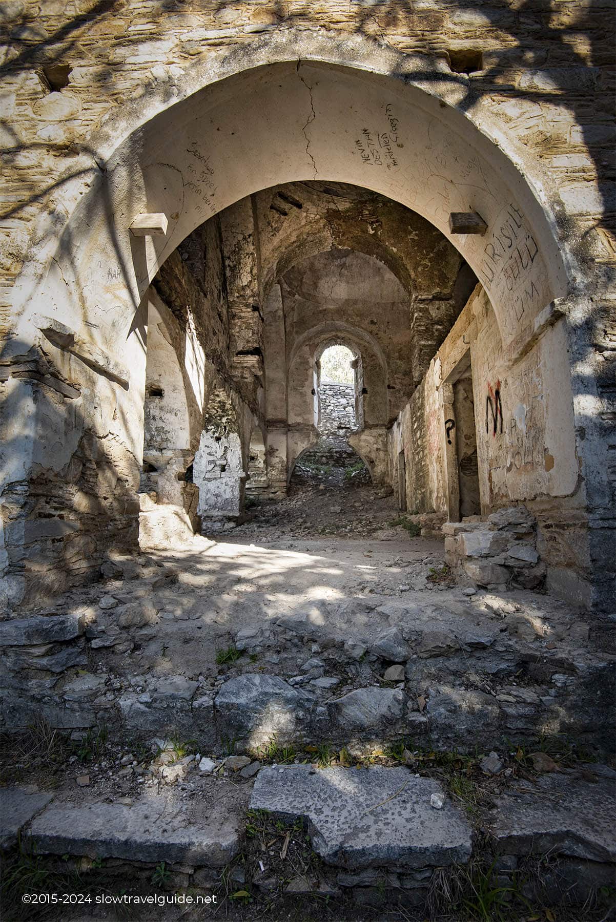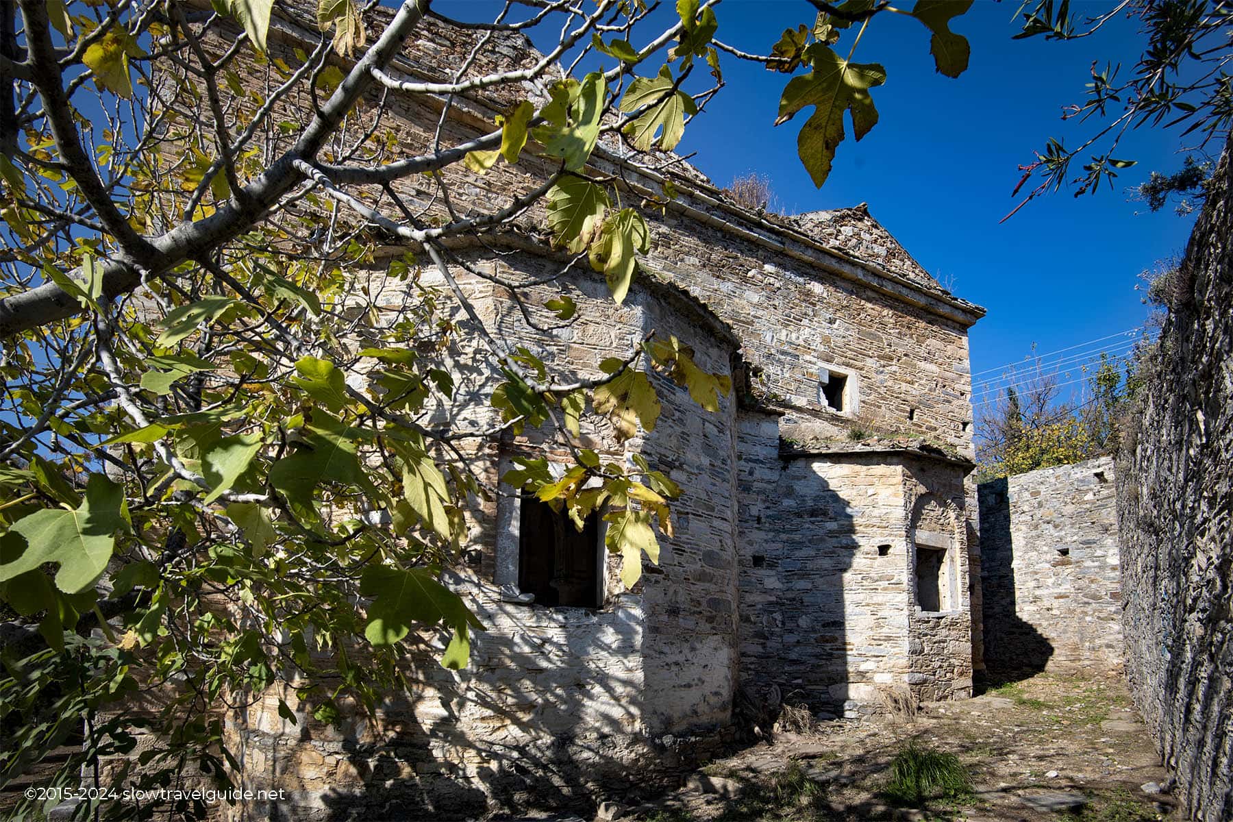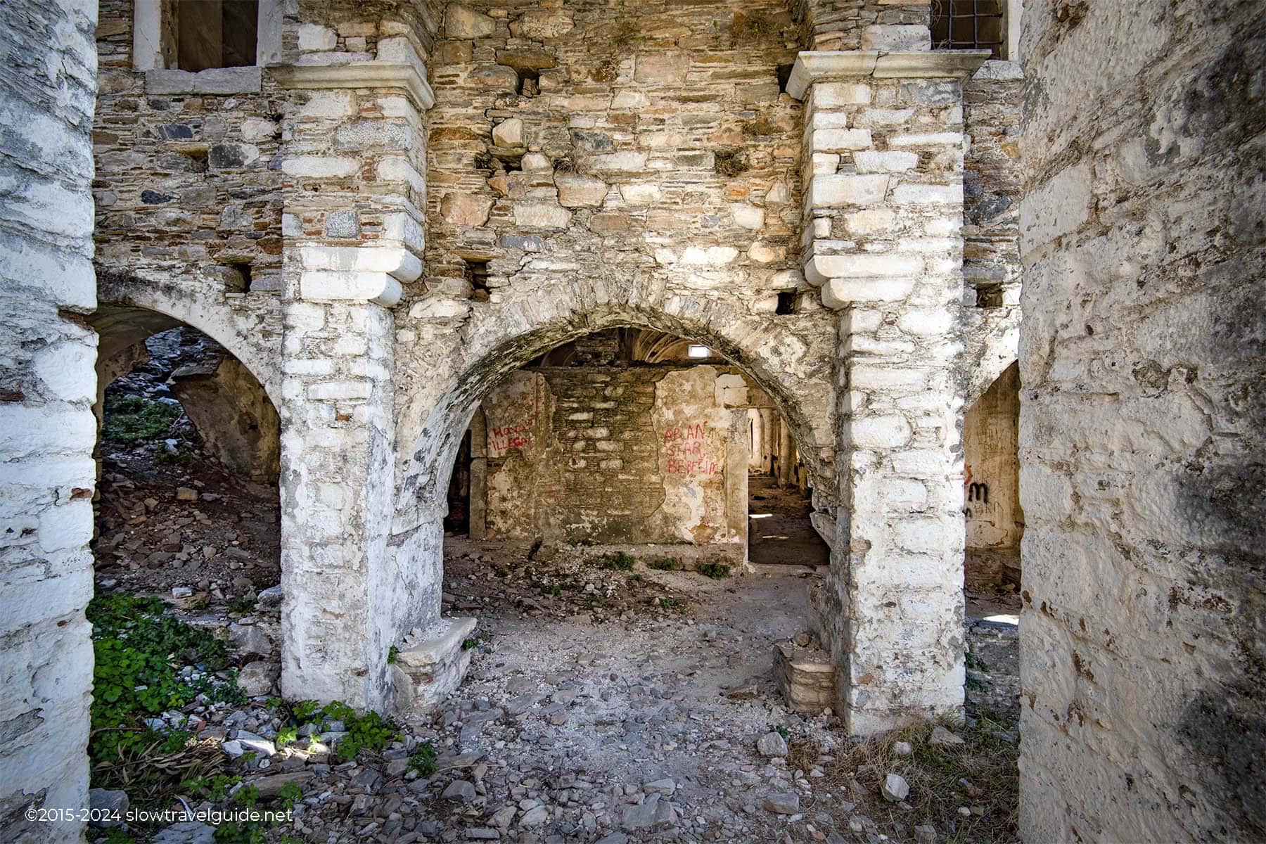 İki apsisi ve iki göbeği olan bu kilisenin ön salonunda tipik bir Yunan çan kulesi var. Güzel ve sessiz bahçede dolaşırken gördüğümüz iskelet kalıntıları karşısında şaşkınlığımızı gizleyemedik.