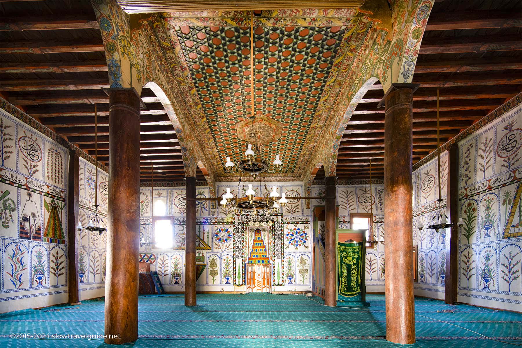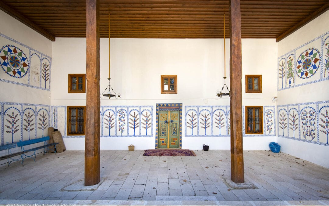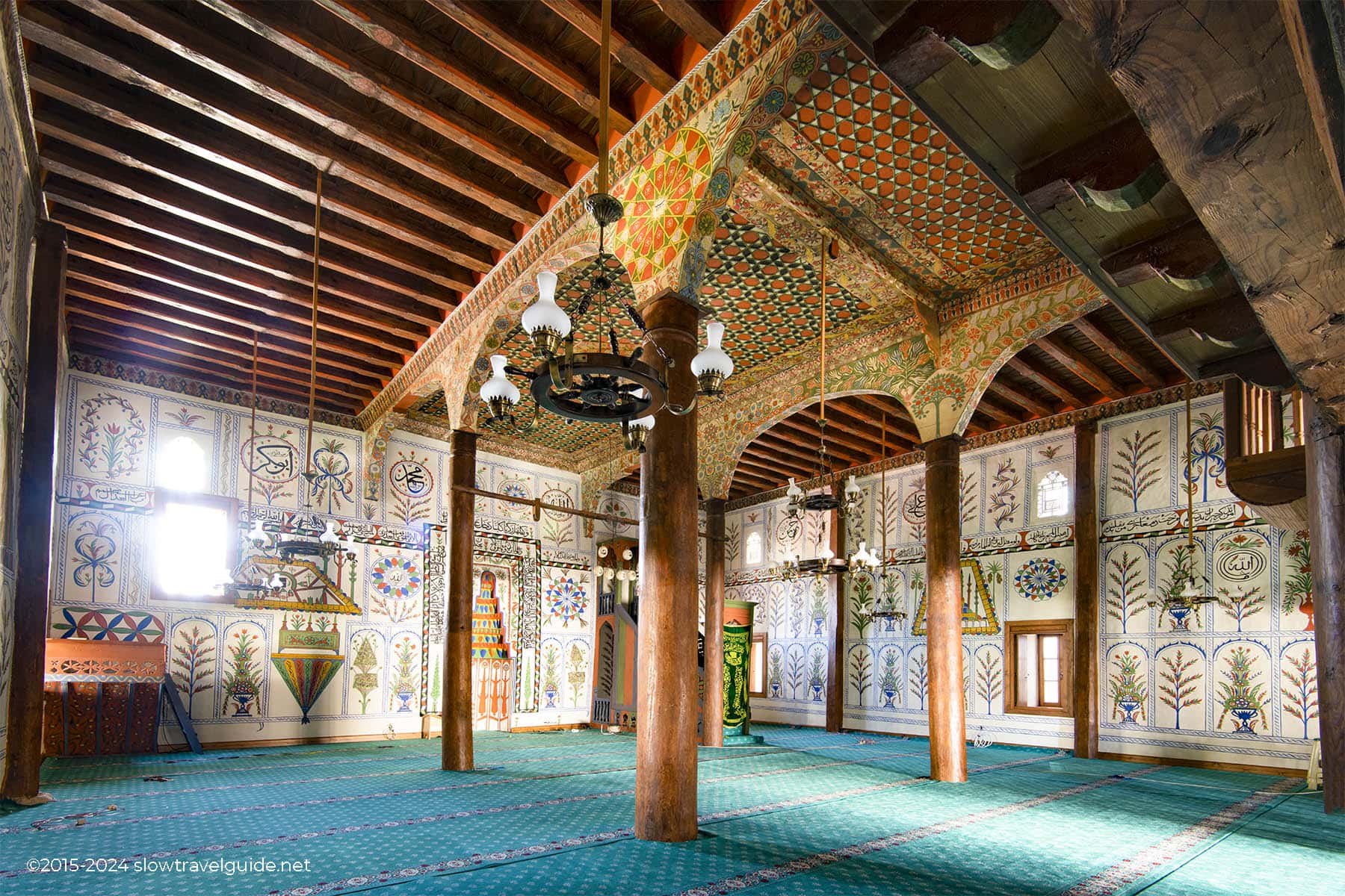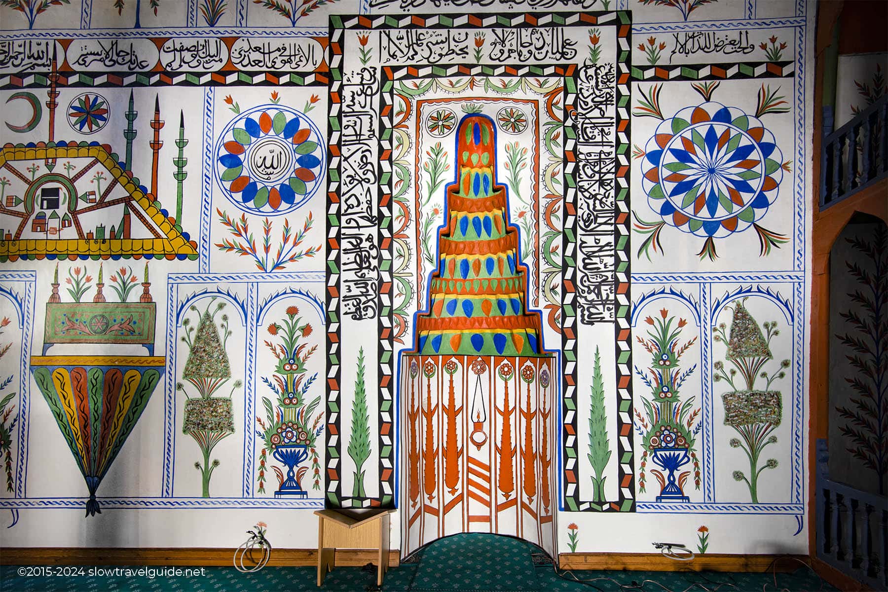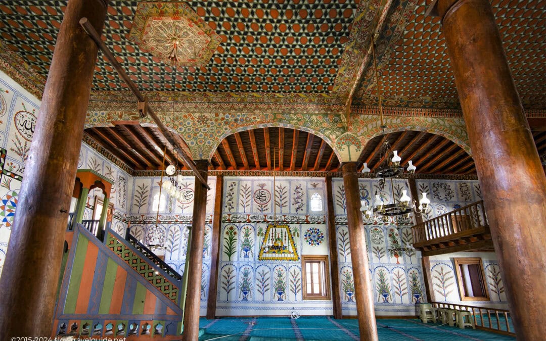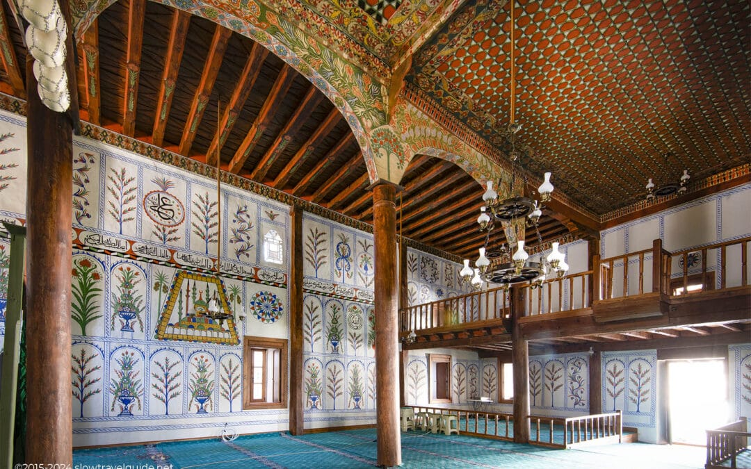 The exact date of the construction of the Boğaziçi Mosque is uncertain. Nonetheless, everyone agrees that the date above the front door denotes the building’s construction year of 1772. An additional date-mark dated 1877 most likely designates the time the spectacular murals were added. Whatever the age of construction, this mosque is a magnificent display of the woodworking and painting skills of the masters. Your eyes are met with an explosion of colour and shape everywhere you turn. The hexagonal lath-covered ceiling is painted in every detail, producing a piece of almost excruciating beauty.