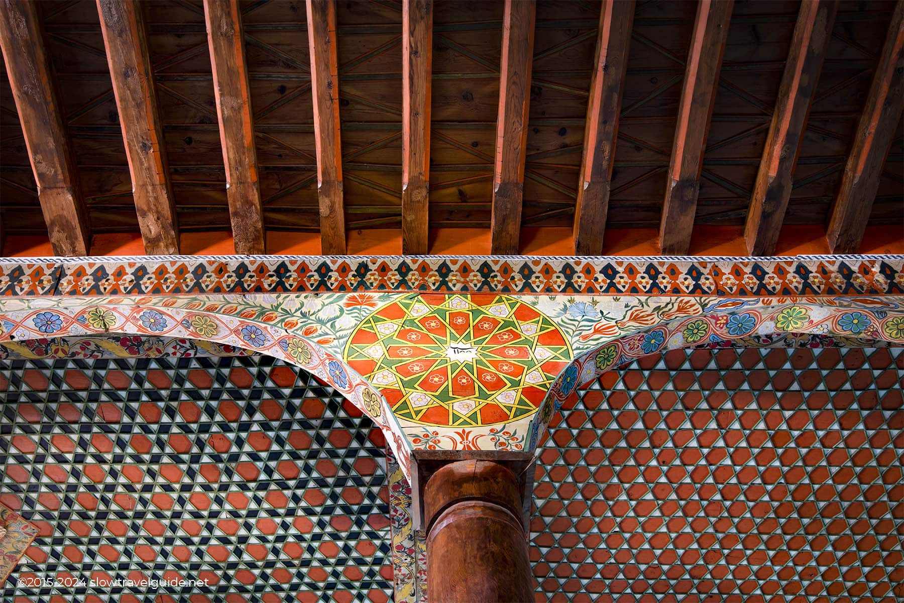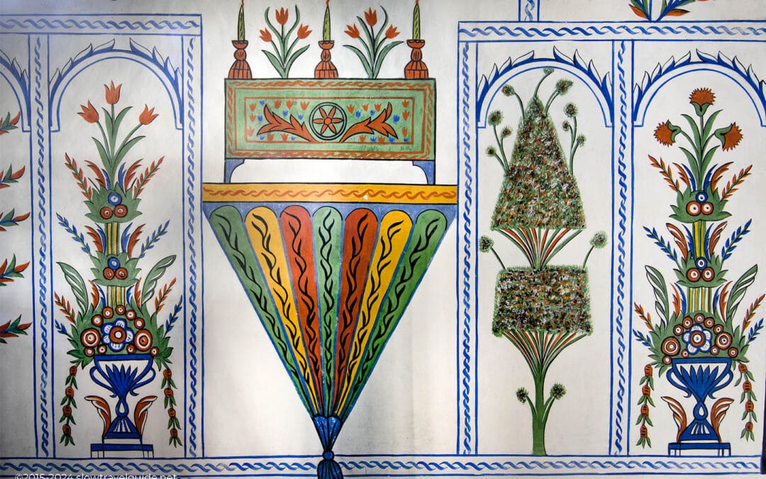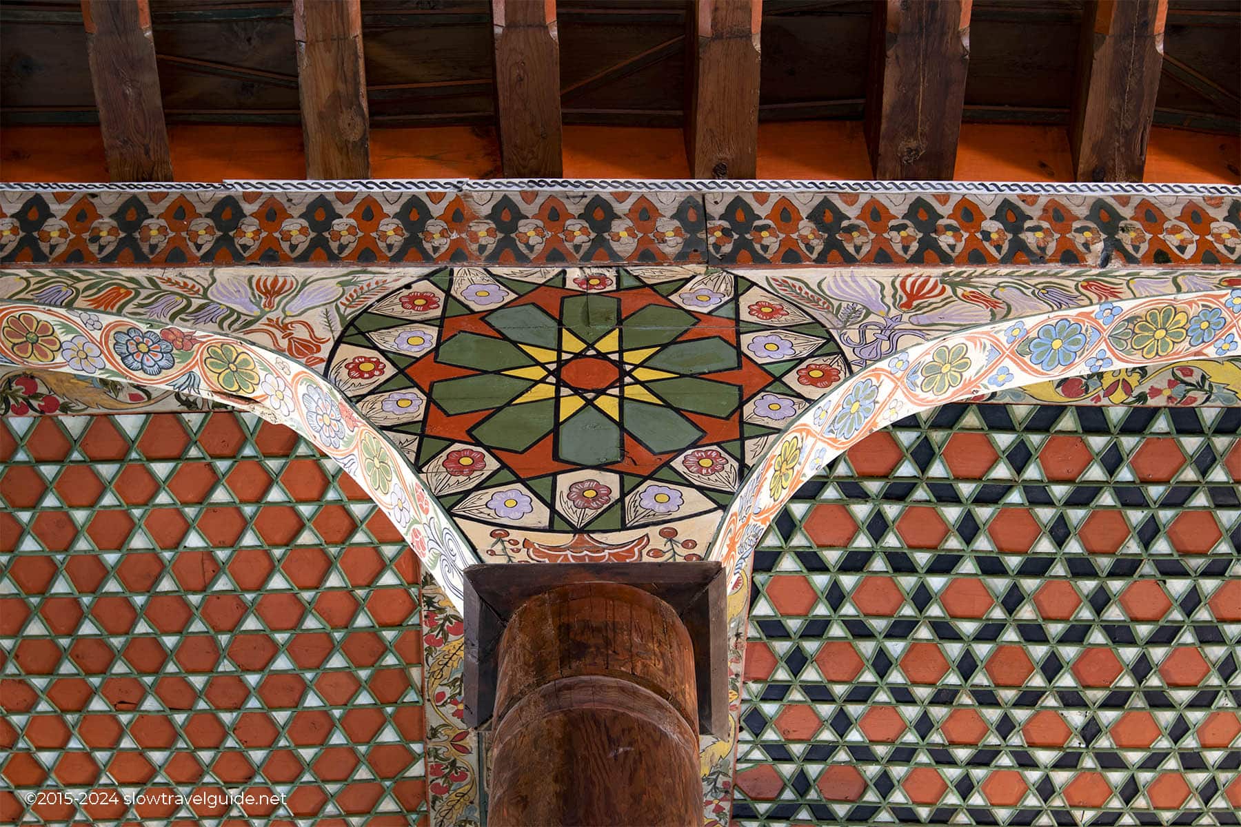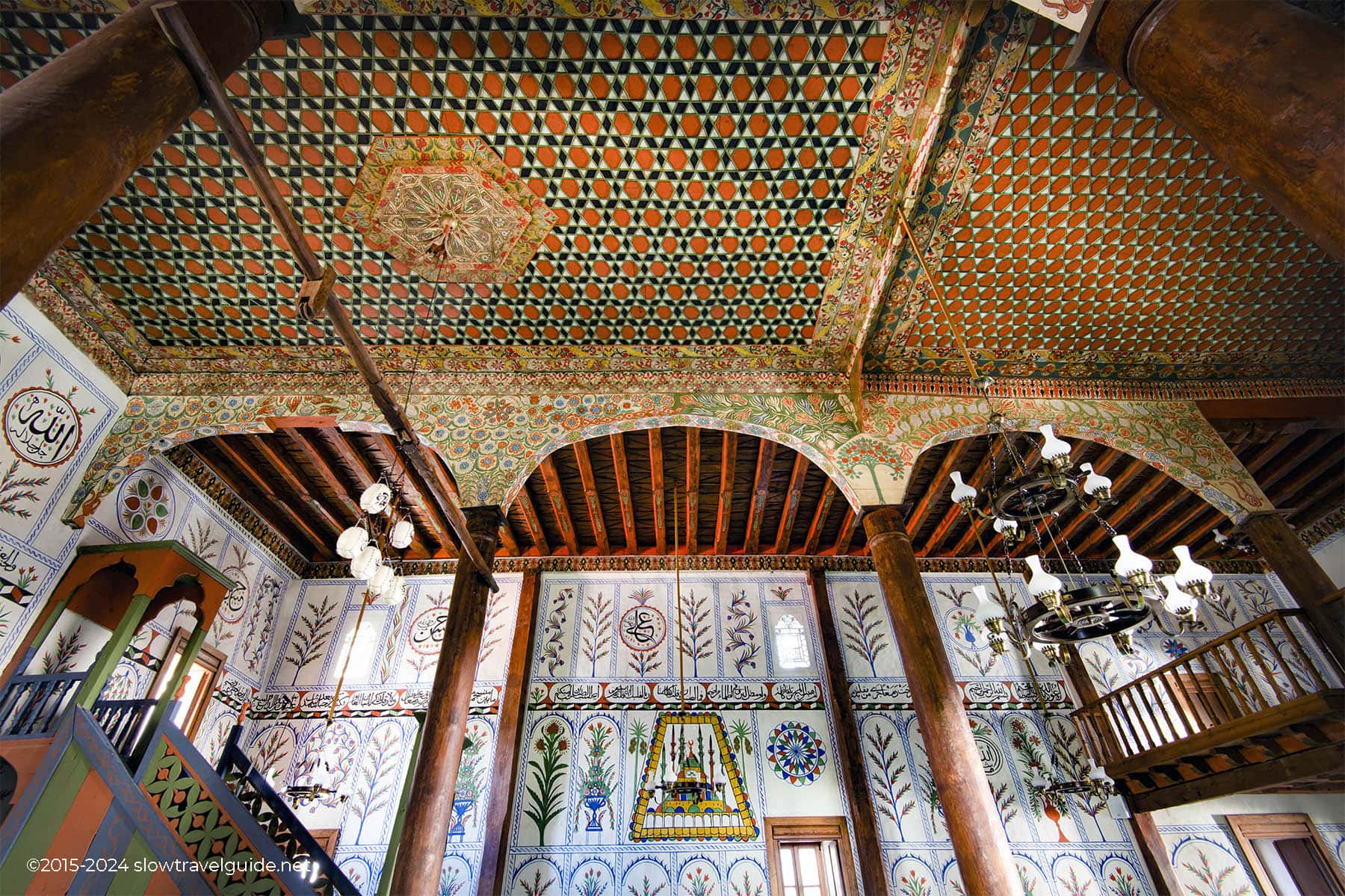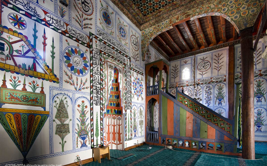 The exact date of the construction of the Boğaziçi Mosque is uncertain. Nonetheless, everyone agrees that the date above the front door denotes the building’s construction year of 1772. An additional date-mark dated 1877 most likely designates the time the spectacular murals were added. Whatever the age of construction, this mosque is a magnificent display of the woodworking and painting skills of the masters. Your eyes are met with an explosion of colour and shape everywhere you turn. The hexagonal lath-covered ceiling is painted in every detail, producing a piece of almost excruciating beauty.
