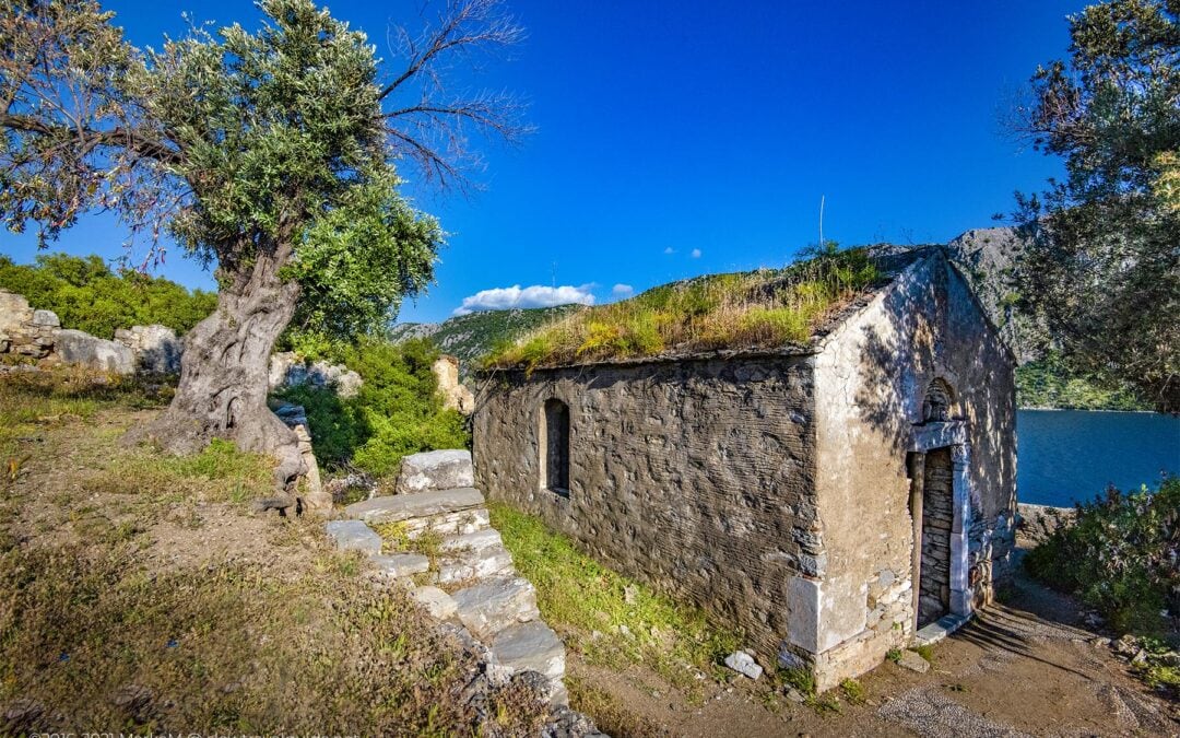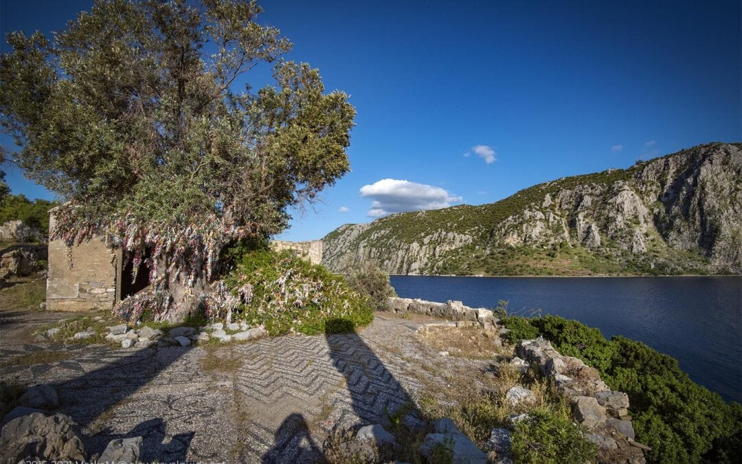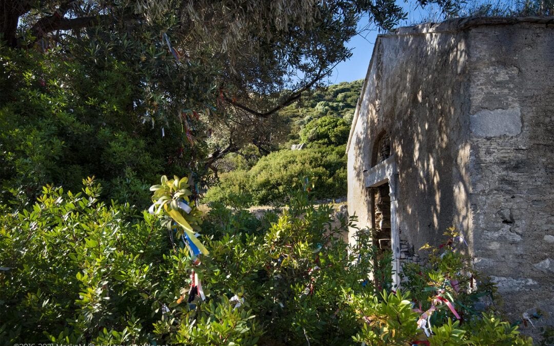 There is a centuries olive tree in the middle of the courtyard, which is older than the church. Tourists on the island turned it into a wishing tree. We did not leave a ribbon because our wish had been fulfilled: no one could be seen on the island at sunset. Amazing!