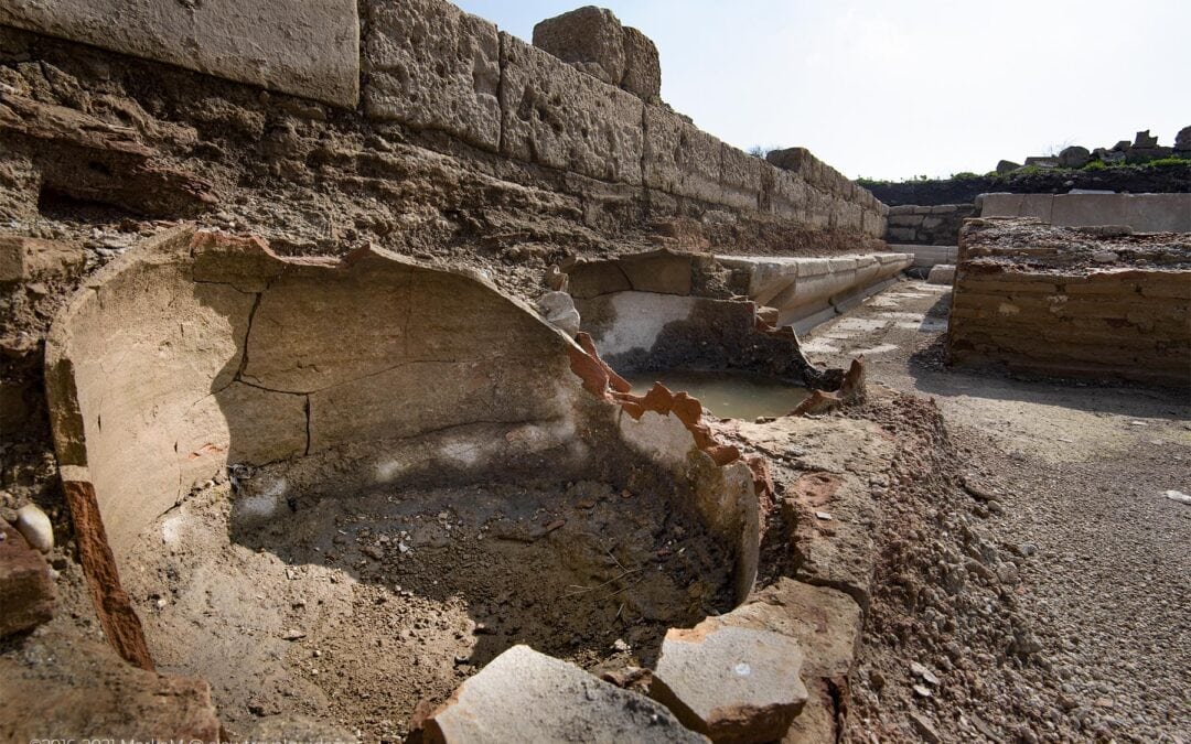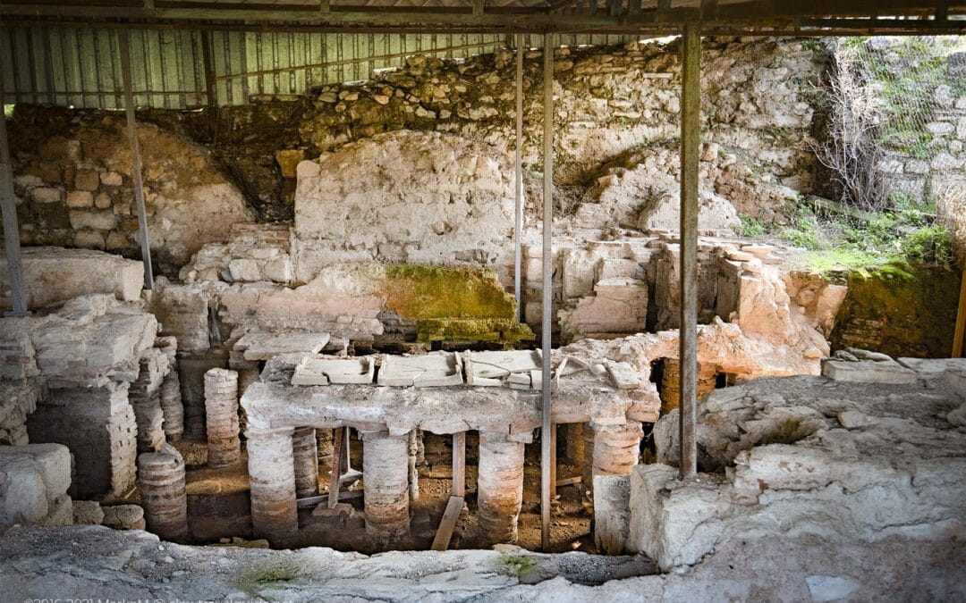 One place that looks promising is the Hypocaust building. It was named after an advanced heating system (or hypocaust) discovered there. You will find it next to the cemetery and the remains of the mosque in the fenced area.
