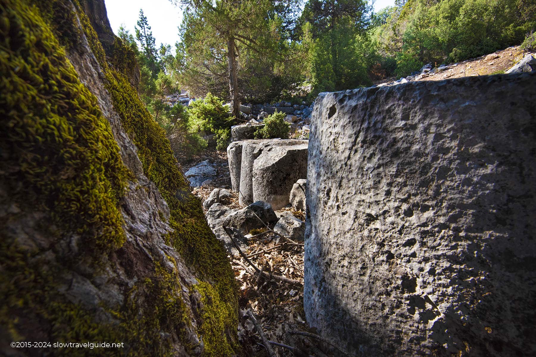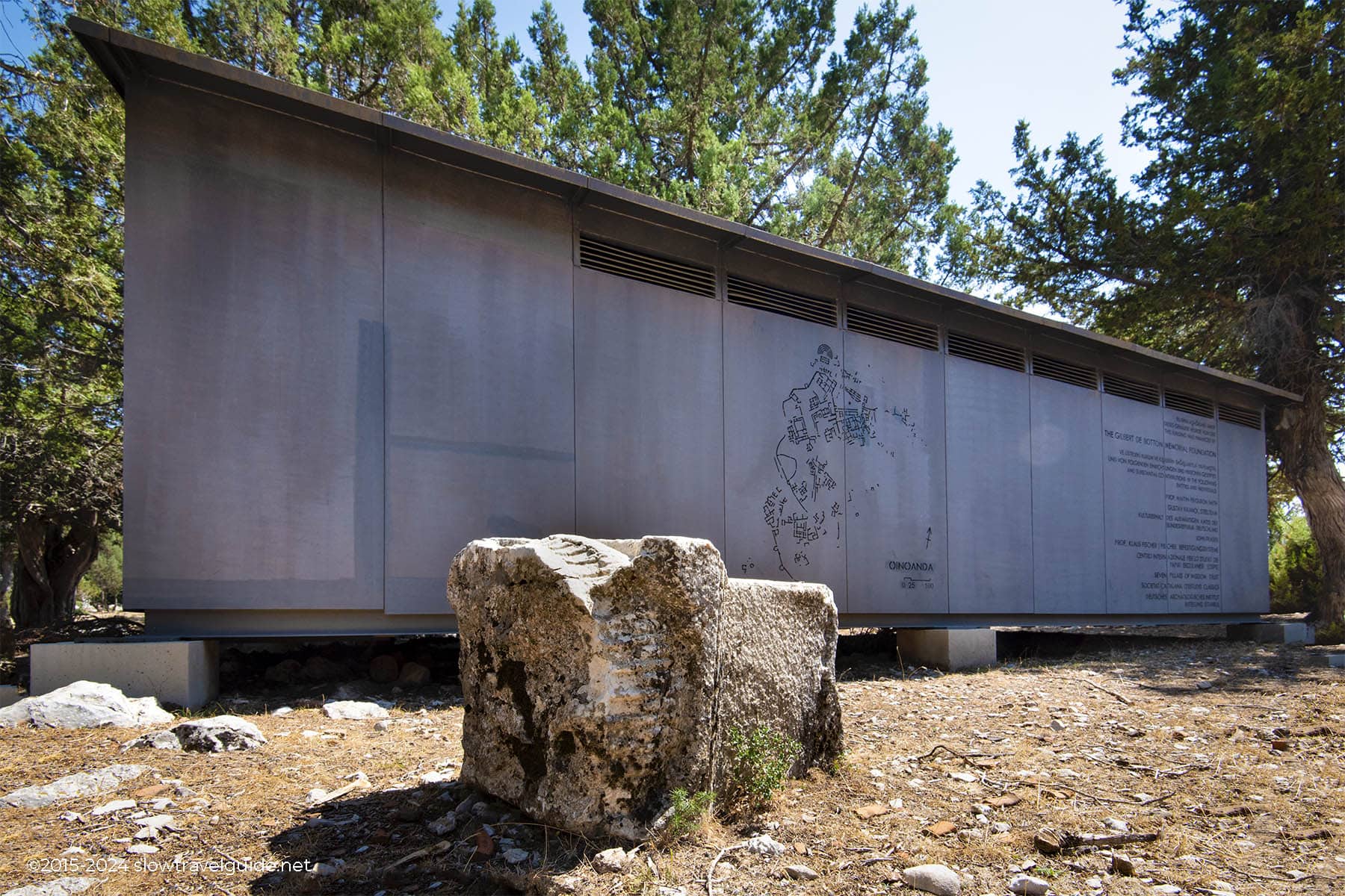Take the path to the right of the Oinoanda sign and follow the trail. Don’t forget to stop and enjoy the view from time to time! Though we fear you will do this eventually if only to catch your breath. Once on-site, take your time to have a look around. There’s nothing much to guide you apart from a rather arty city plan on the steel shed. Largethat parts of the site are only accessible after conquering a pile of stone or some dense forest vegetation.