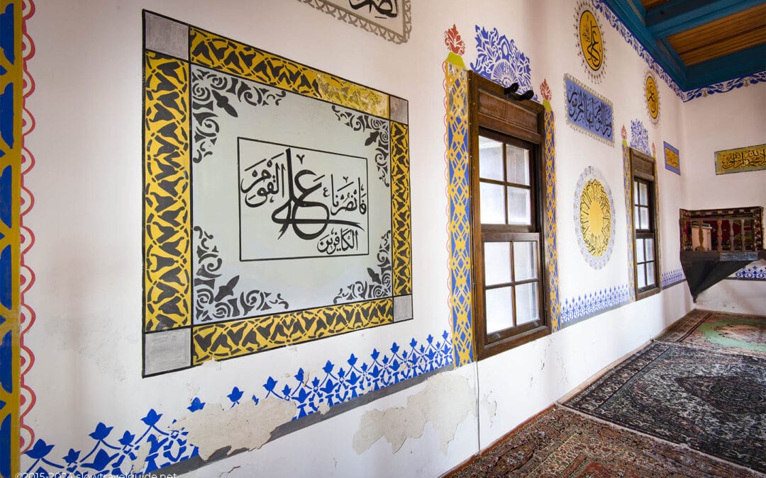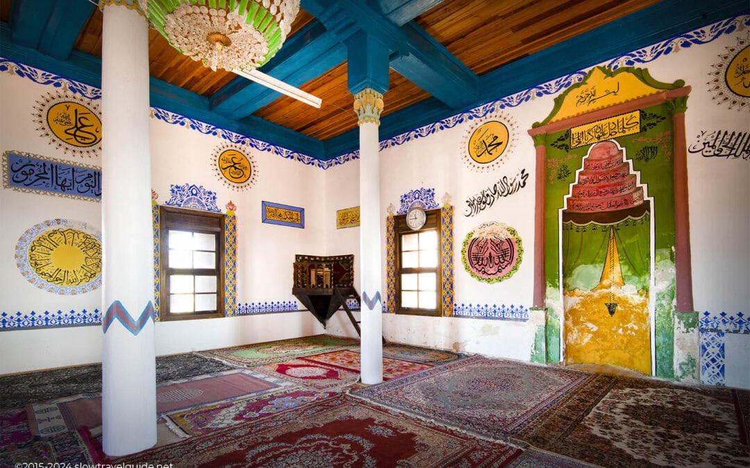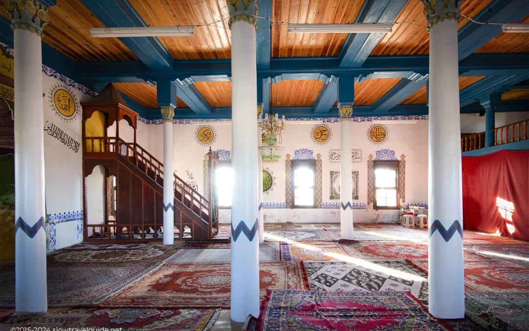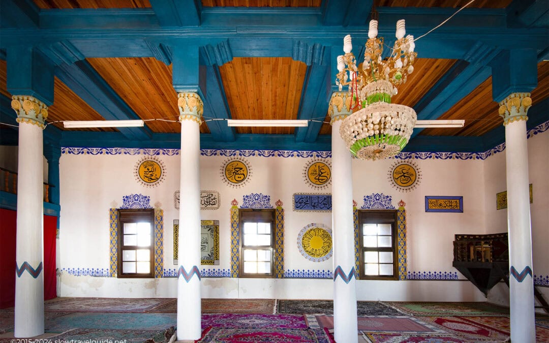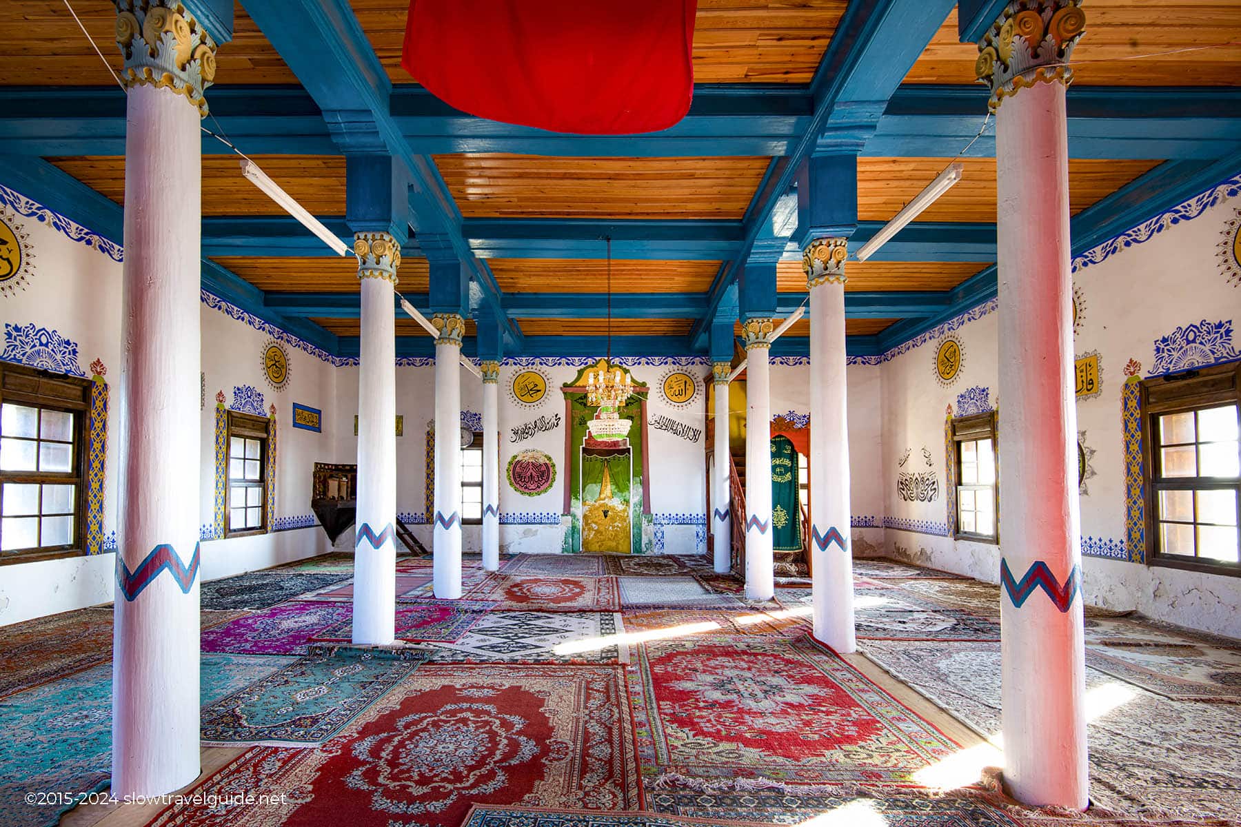 Although the exact year of the mosque’s construction is unknown, scholars believe it was constructed during Cevher Paşa’s lifetime in the 14th or 15th century. It is thought that the date (1235/1819-20) painted above the entryway alludes to a significant restoration. The mosque’s interior is a rainbow of hues. Vibrant decorations adorn the timber pillars and walls, while the wooden floor is finished with a patchwork of rugs and kilims.