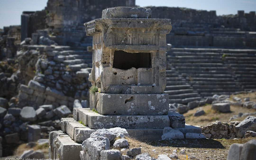 Nevertheless, there are still plenty of striking ruins to see in Xanthos, like the theatre, the Xanthian Obelisk, the Pillar Tomb, and the Harpy Tomb. Beautiful marble reliefs at the pinnacle of the Harpy Tomb show sirens stealing the souls of the deceased. The original marbles that are on display at the British Museum have been replaced with casts. The adjacent Pillar Tomb is a special kind of tomb that is not seen anywhere else in Lycia. It combines two tombs: a pillar tomb and a Lycian sarcophagus.